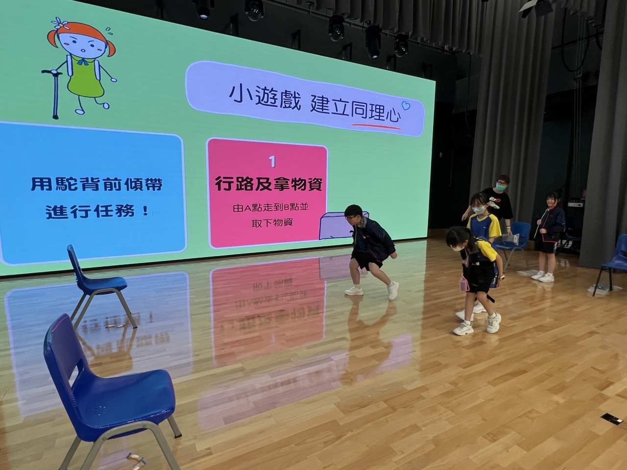 在活動中,四年級及五年級同學透過不同的遊戲,體驗長者及殘疾人士的需要,學習在生活中幫助有需要的人。